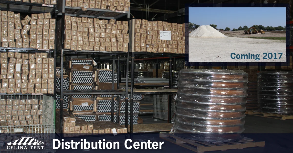 The groundwork for our new Distribution Center will be completed in early October, with the final move from our current warehouse (located in Coldwater, Ohio) occurring during the Fall of 2017. With a new facility comes the ability to design our layout to best suit our specific storage and shipping needs, allowing us to keep the orders flowing in an orderly and efficient manner. Our ability to send the products you need to you with all speed is our goal; with every improvement, Celina strives to make your tent and event supply order experience the best it can be!