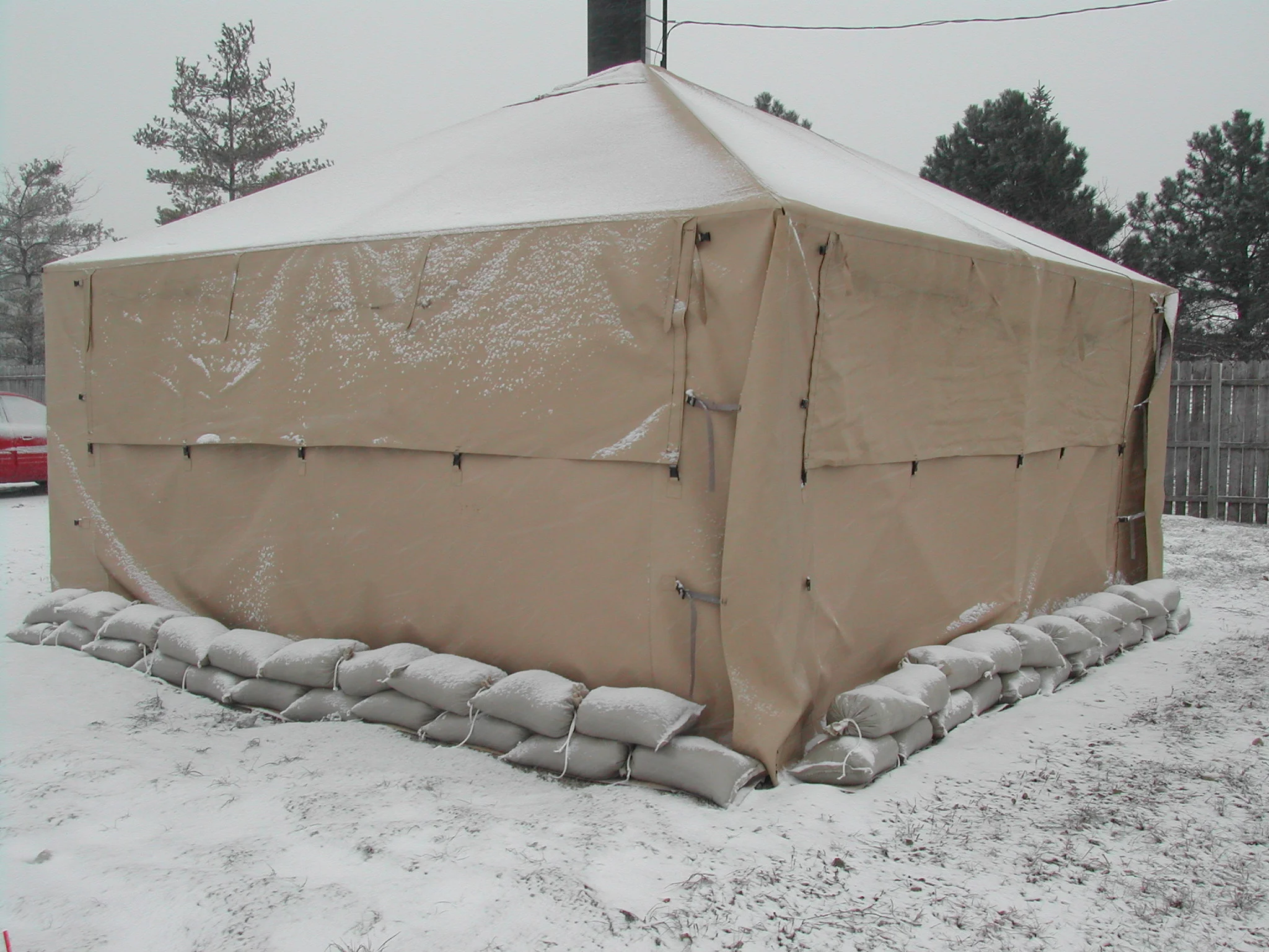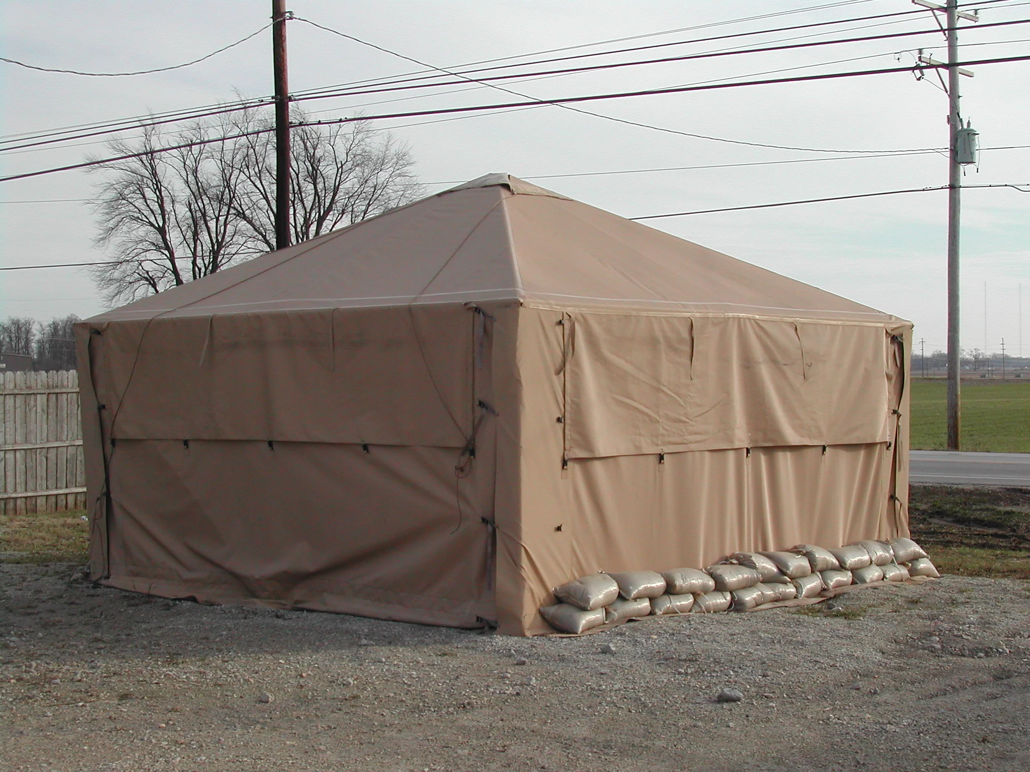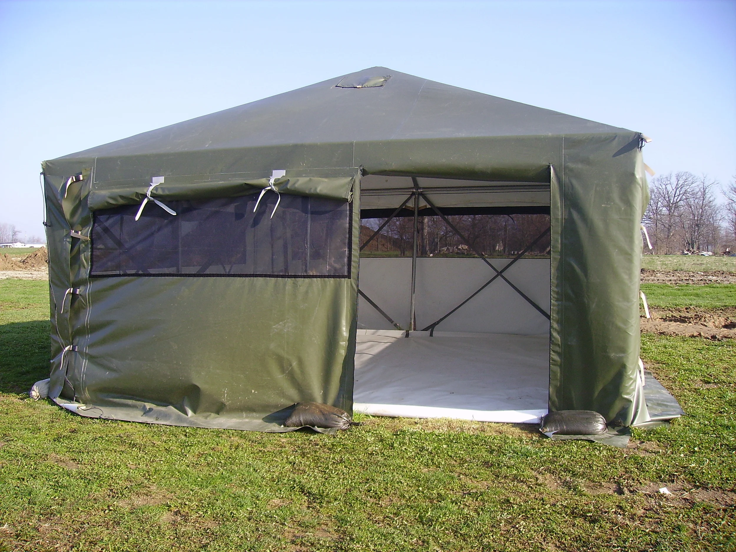 Our premiere disaster relief design is the Humanitarian & General Purpose Tent System (HGPTS), a 16’x16’ non-tactical shelter designed to offer an economical solution for humanitarian aid in the event of a natural disaster or conflict worldwide. Each is made from materials resistant to water, ultra violet light, mildew, and fungus, and made flame retardant. The design is made to be compactable and portable, capable of withstanding varying weather conditions and terrains (excepting arctic). General purposes include: Medical facilities, billeting, field services, and storage.
